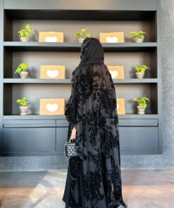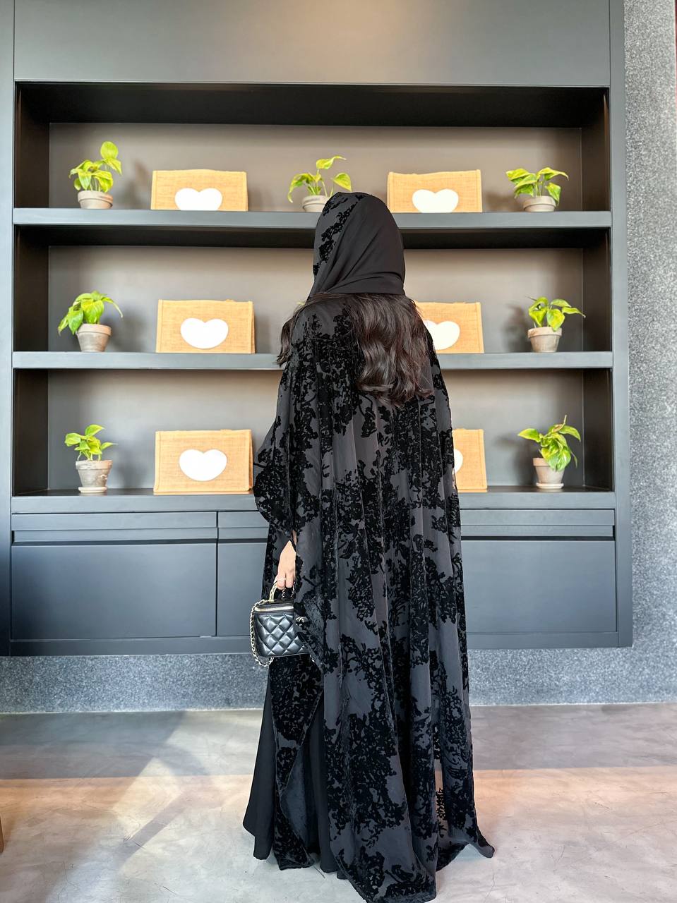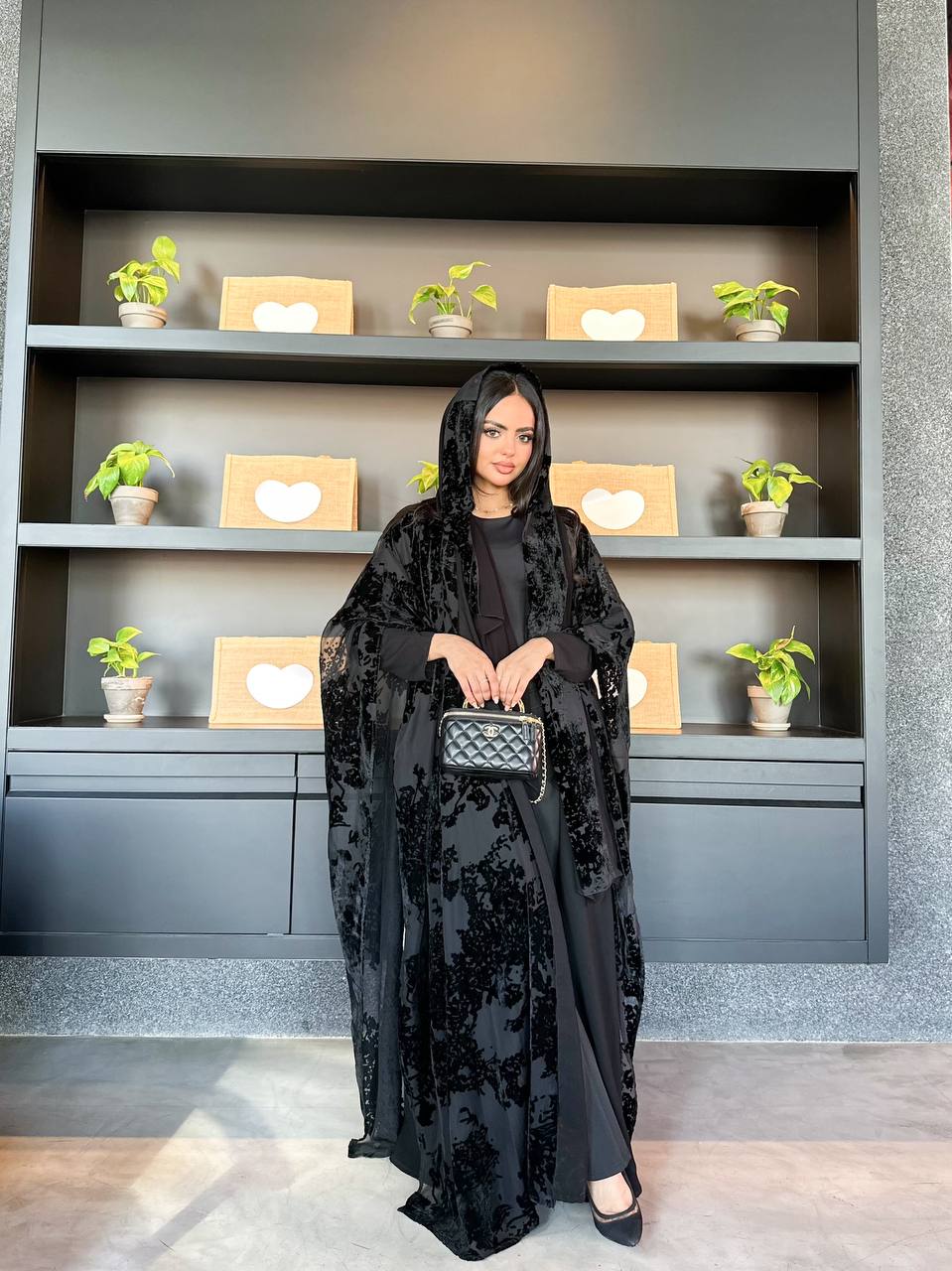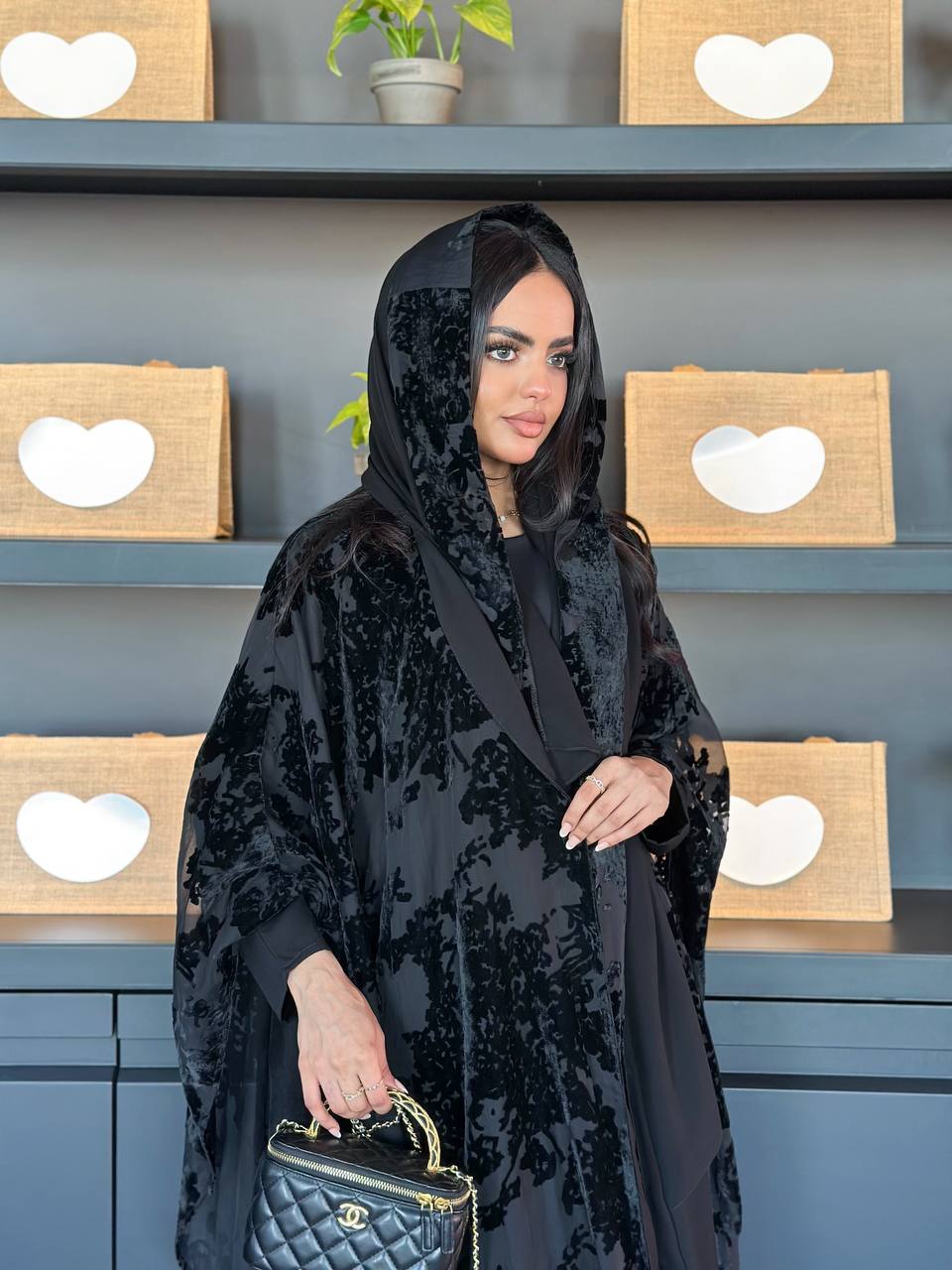 القماش الداخلي أسود سادة يمنحك راحة وأناقة بسيطة، بينما القماش الخارجي المخملي المنقوش يضفي لمسة راقية تلفت الأنظار. أكمامها بتفصيل متقن من قماش غير استرتش يمنح ثبات وأناقة عند الحركة، ومعها طرحة سوداء