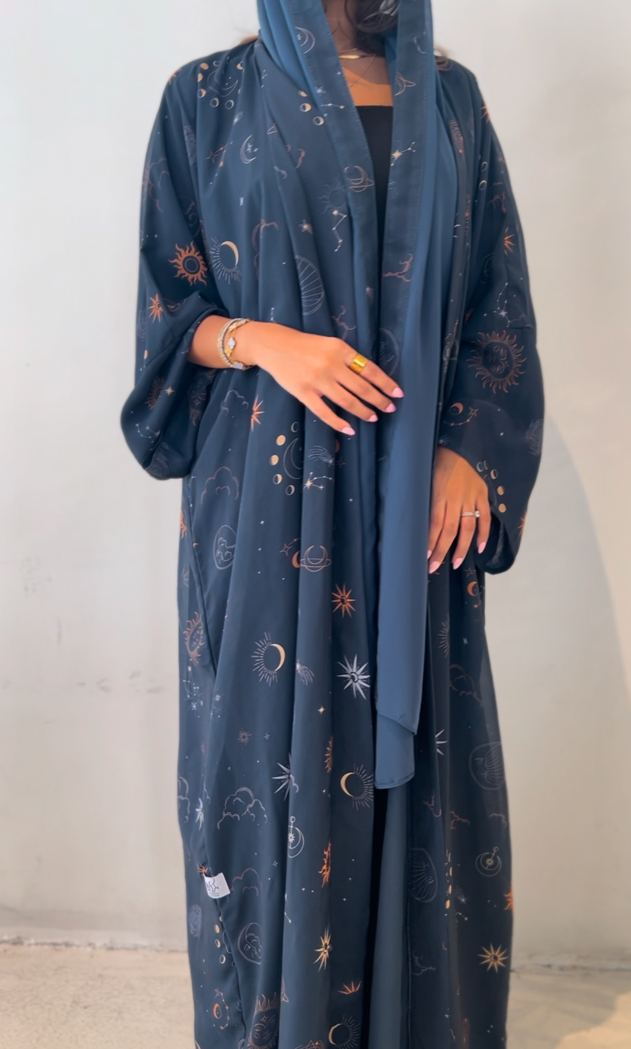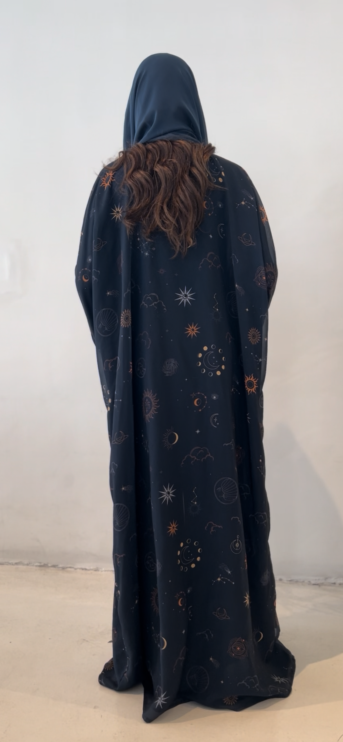 عباية شيفون مبطن بطبعات قمر و الشمس مقاس ٥٦