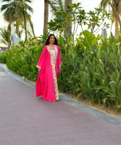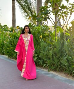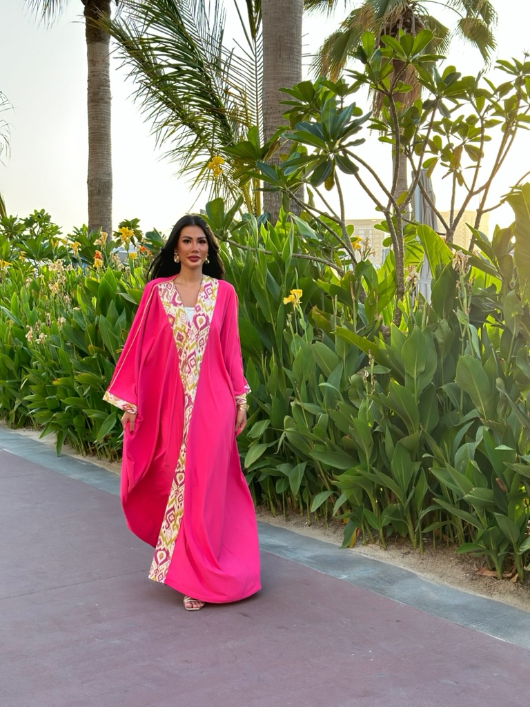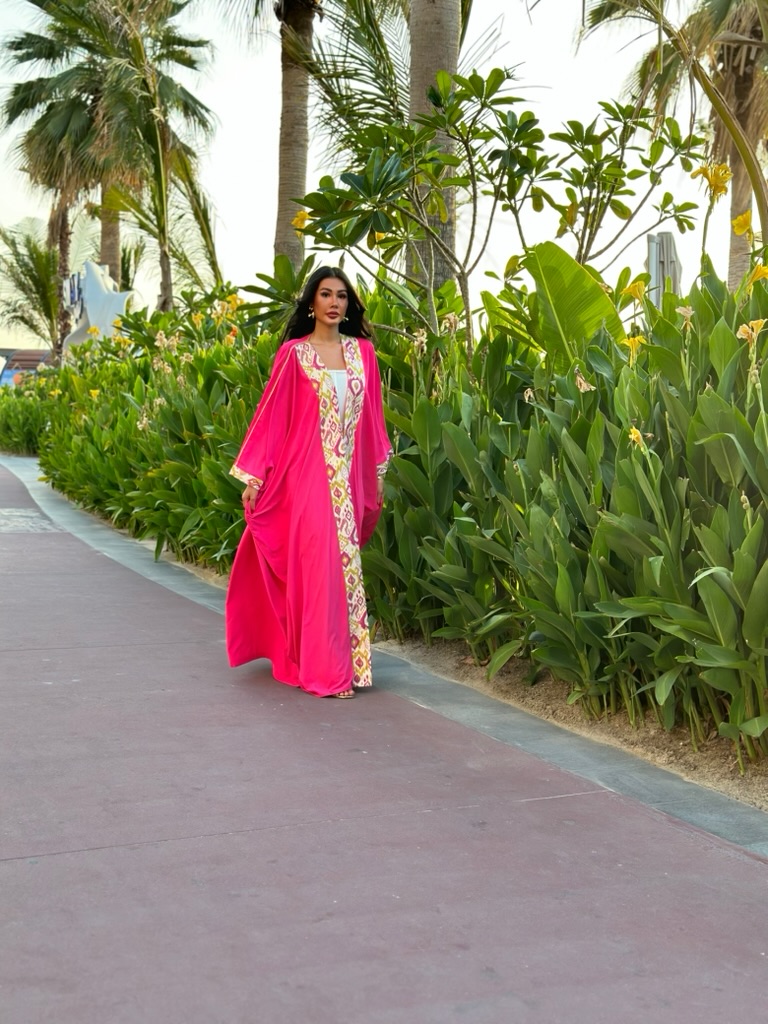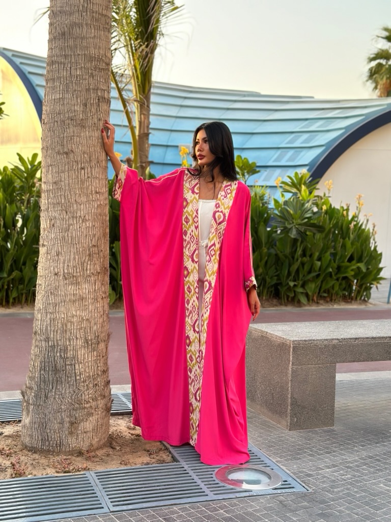 pink abaya in satin matt fabric with beautiful fabric decoration in front and sleeves